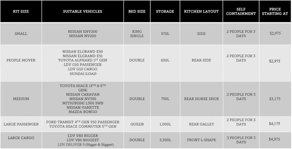 We have over 20 kitset options options to cover the main kiwi vans. We have split out range into Small, People Mover, Medium & Large based on the length of the van. Each category has been optimized for the space available, offering solutions from a van deck length of 2m to 3.4m.