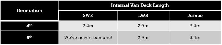 1. The 5 th gen had no SWB, so people refer to the LWB as the SWB because it’s the shorter of the two wheel bases. But, its not. It’s the LWB; although it is the shorter offering. We know, it’s confusing.